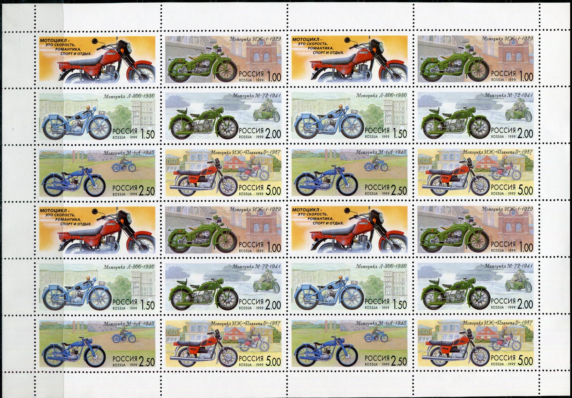 Почтовые марки. Россия. 1999г. История мотоцикла. Лист. №523-527.