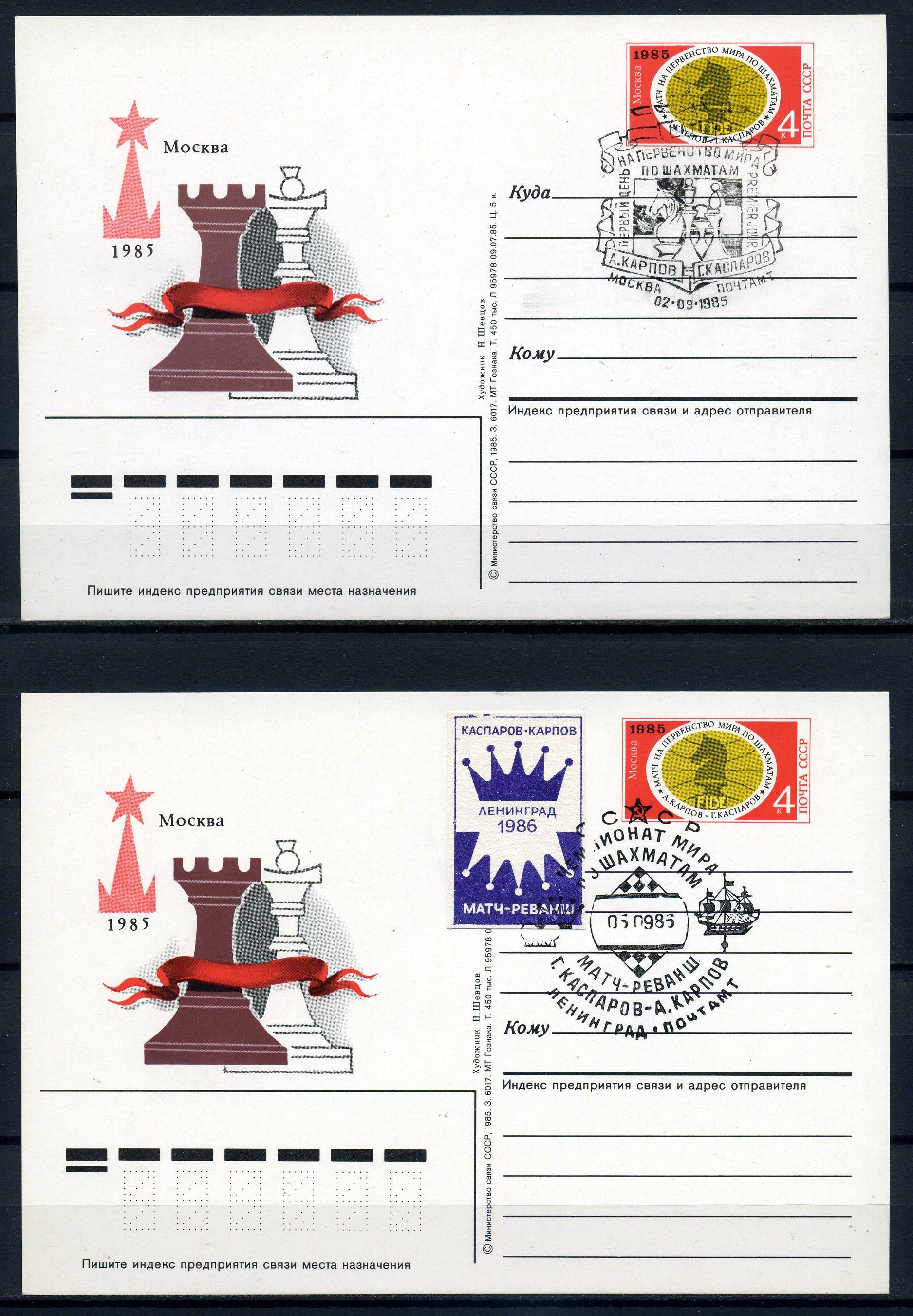 Почтовые карточки с ОМ и СГ. СССР 1986 г. ЧМ по шахматам. Матч-реванш Г.Каспаров- А.Карпов.