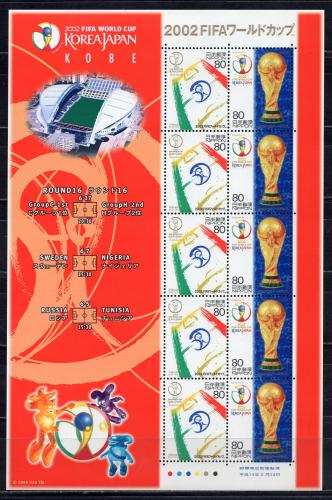 Почтовые марки. Япония, 2002 г. №3348-3349 МЛ. Футбол. Чемпионат мира по футболу, Япония и Южная Корея (2002). Кобе (Mi 18.0 e)