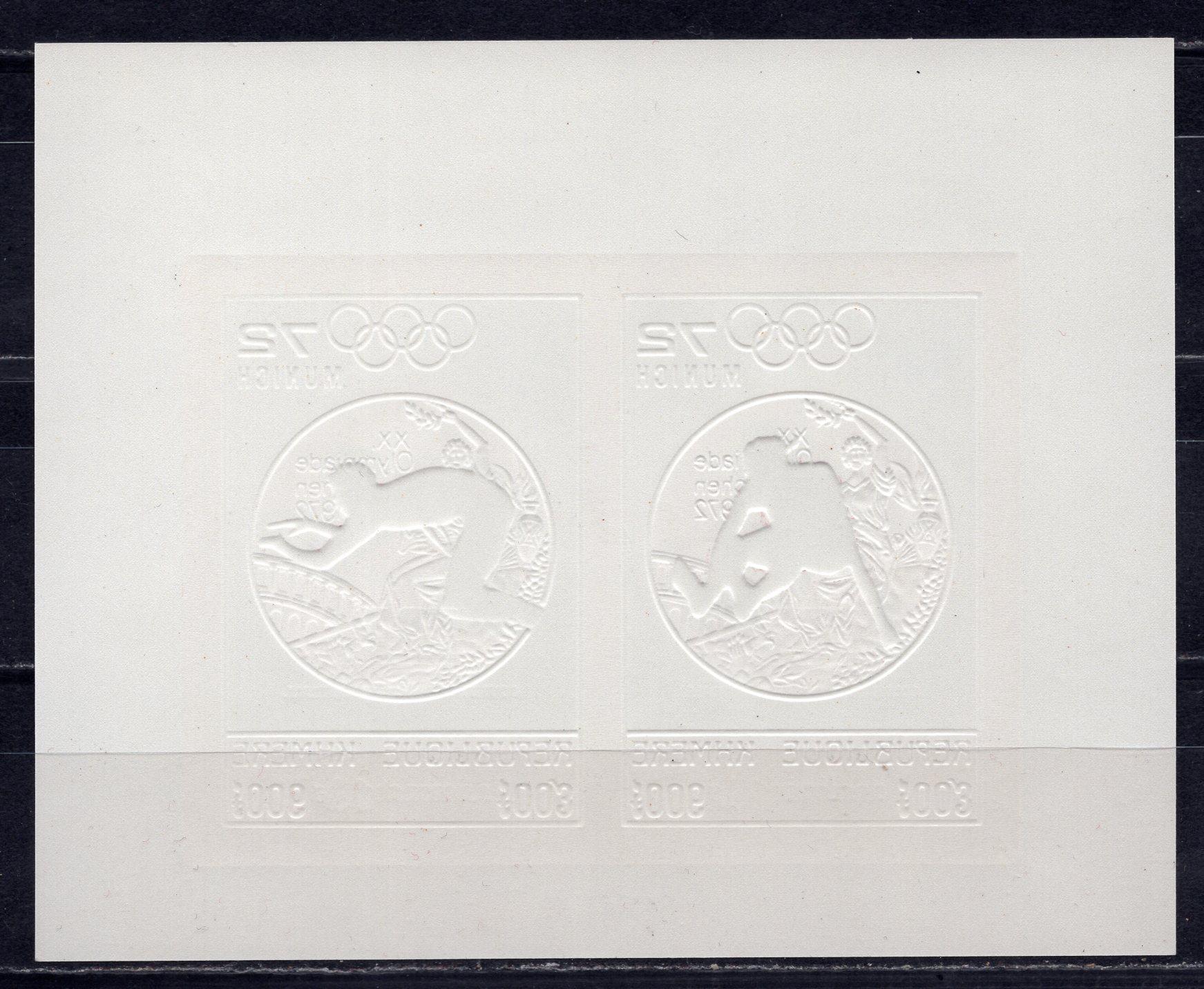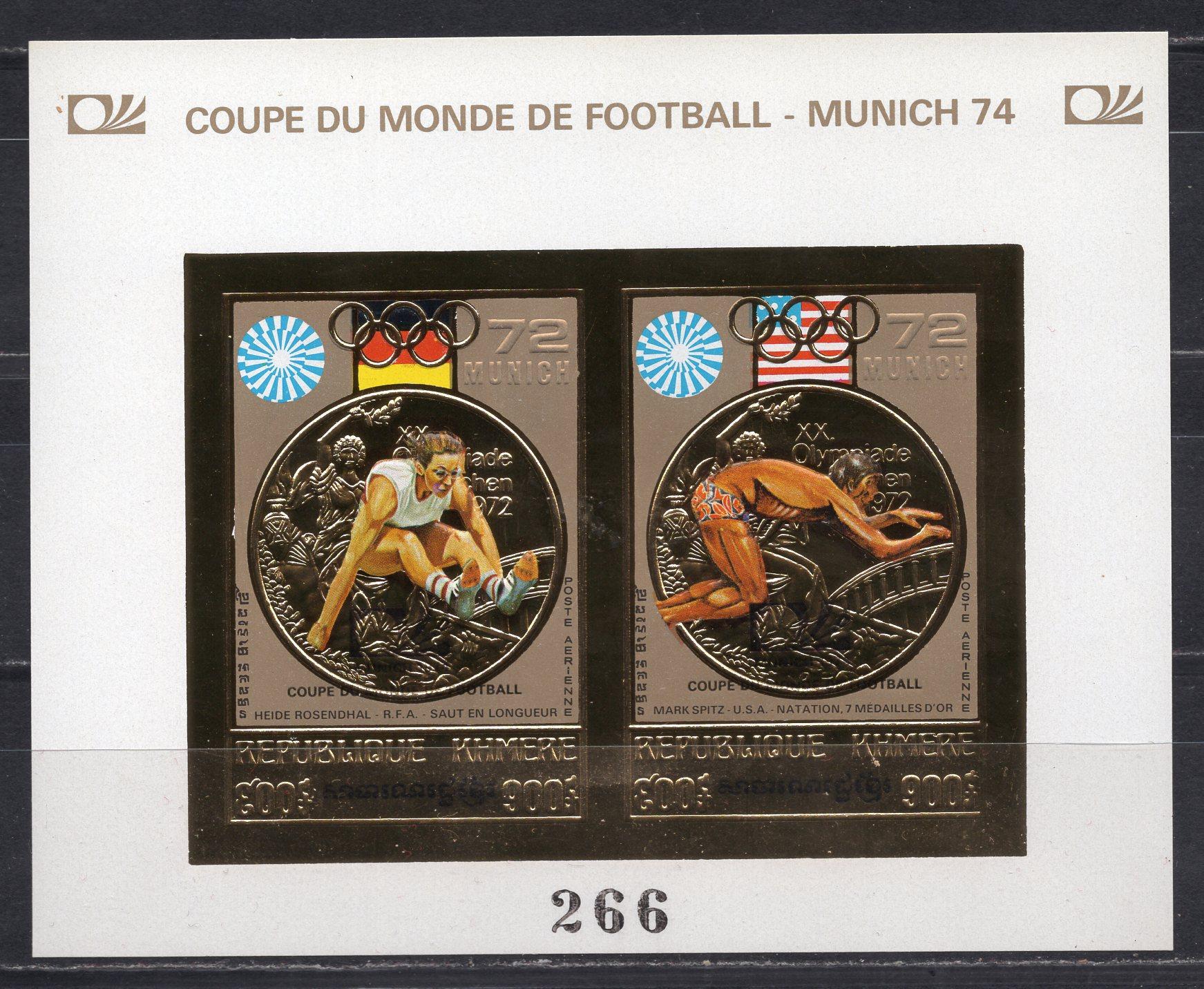 Почтовые марки. Камбоджа, 1973 г. Бл. №35 В. Фольга. Золото. Безз. Надпечатка: „MUNICH 1974 / COUPE DU MONDE DE FOOTBALL“. Футбол. (Mi 200,0 е)