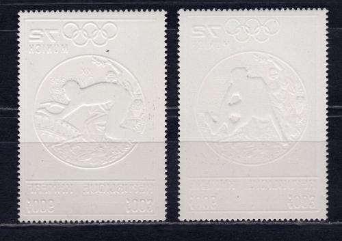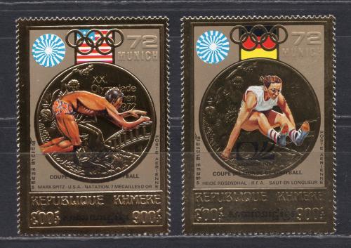 Почтовые марки. Камбоджа, 1973 г. №382-383А. Фольга. Золото. Надпечатка: „MUNICH 1974 / COUPE DU MONDE DE FOOTBALL“. Футбол. (Mi 100,0 е)