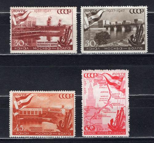 Почтовые марки. СССР. 1947г. Канал Москва-Волга. №1153-1155.1157 (Кат. - 860р.)