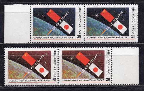 Почтовые марки. СССР. 1990г. Бордовый Космос. Совместный полёт. Разновидность. ПАРЫ. №6273.