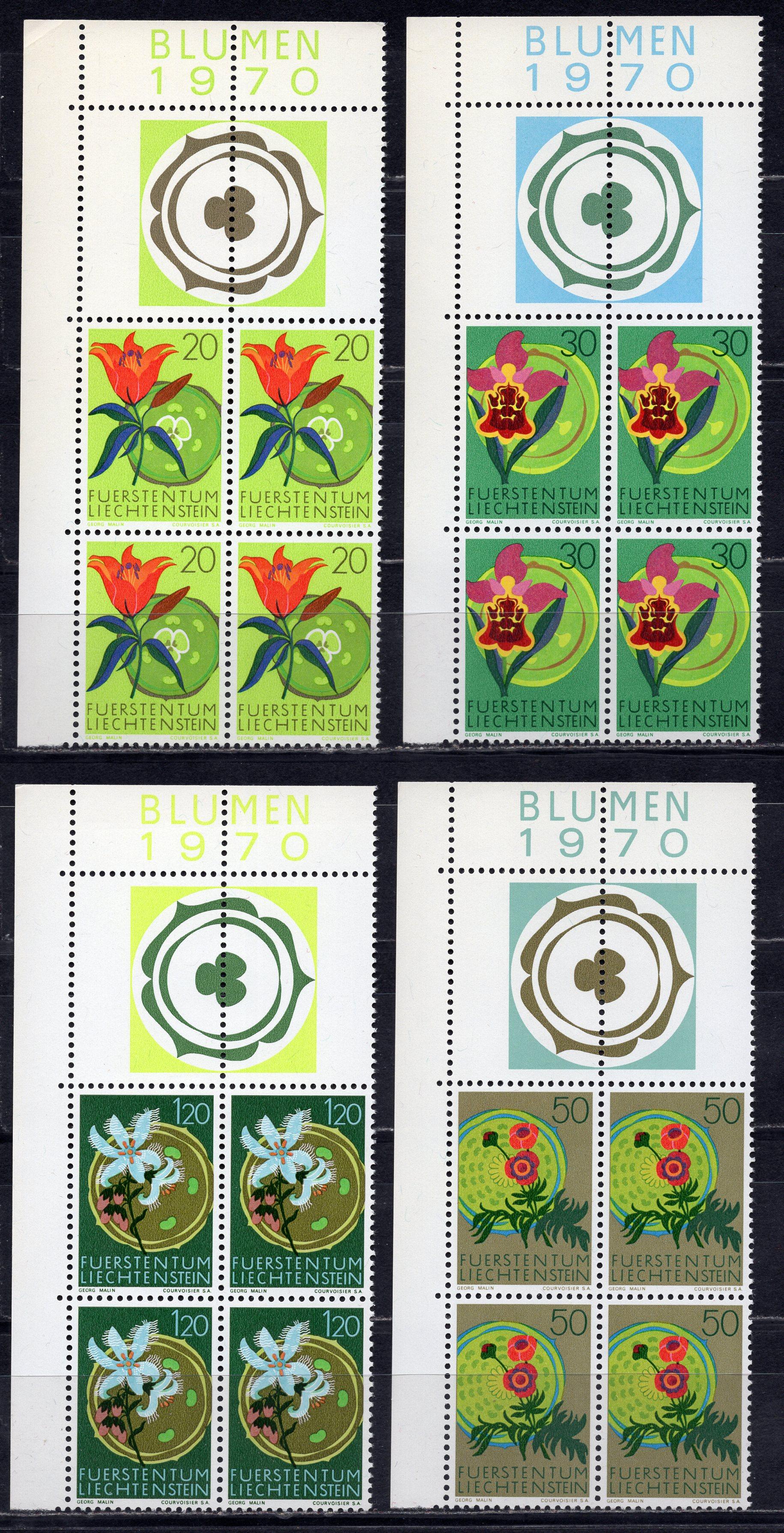 Почтовые марки. Лихтенштейн. 1970г. Цветы. №521-524. КБ. + купон.