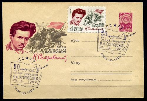 ХМК с маркой и СГ. СССР 1964 г. 60 лет со ДР Н.А. Островского. КО.