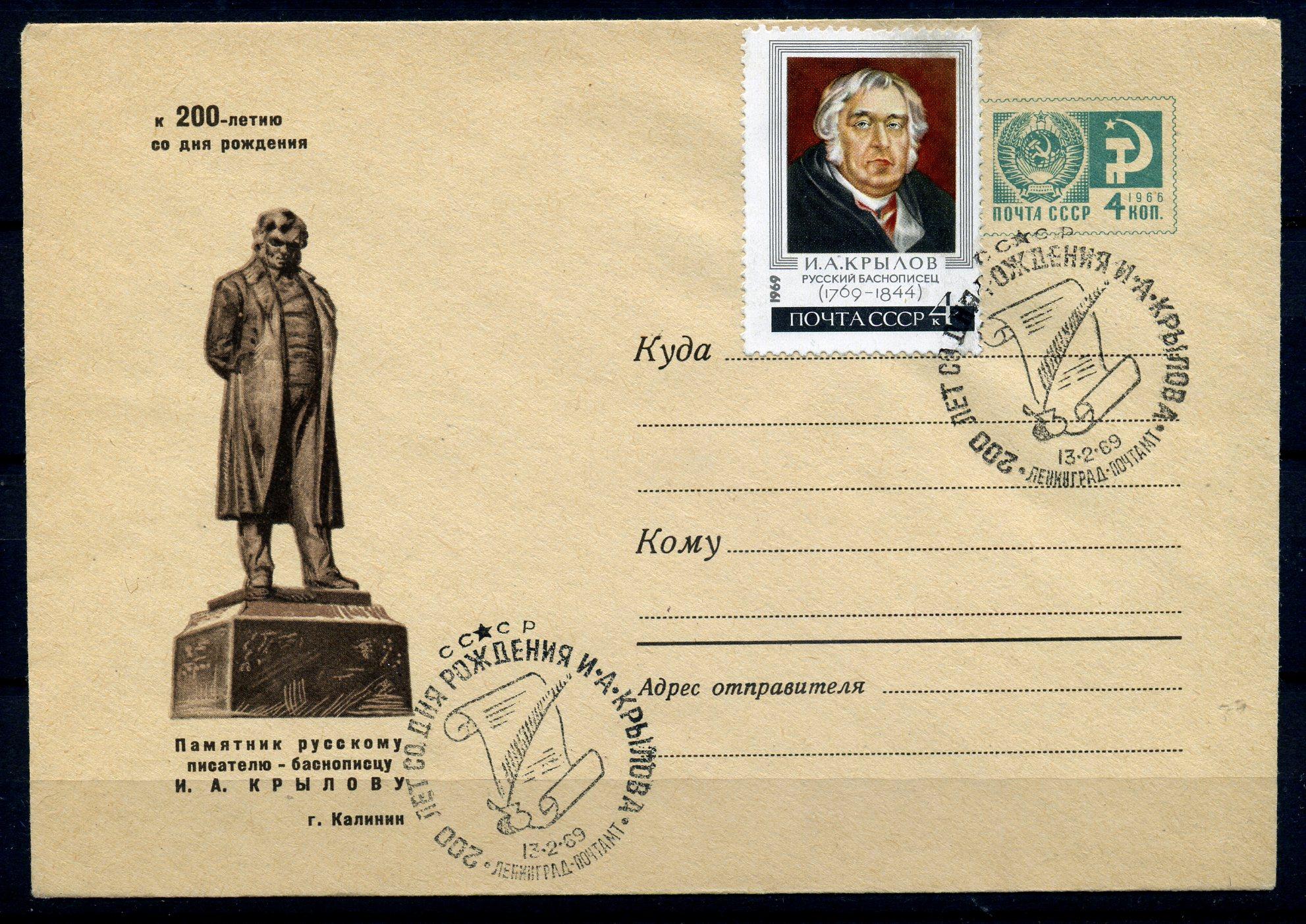 ХМК с маркой и СГ. СССР 1969 г. 200 лет со ДР И.А. Крылова. КО.