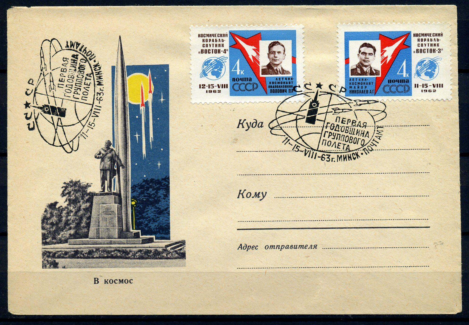 Немаркированный конверт с марками и СГ. СССР 1963 г. 1-я годовщина группового полета. КО.