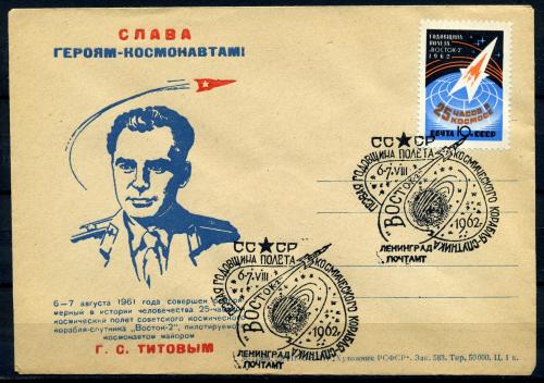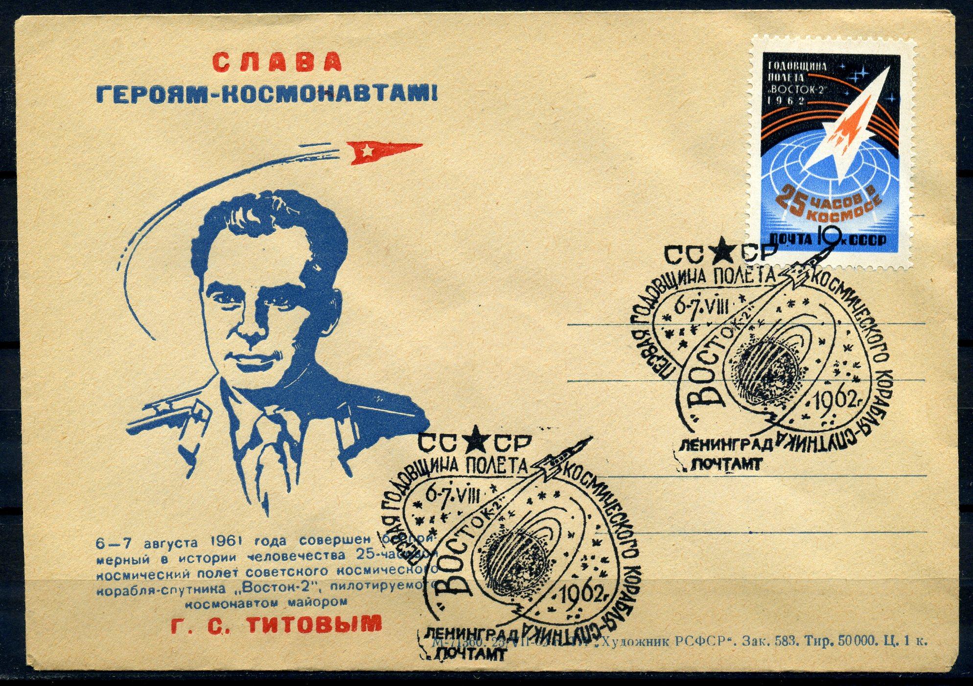 Немаркированный конверт с маркой и СГ. СССР 1962 г. 1-я годовщина полета "Восток-2". КЗ.