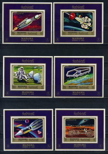 Почтовые марки. Манама. 1970г. Космос. Аполло-13. Люкс-блоки. №291-296. Беззубц.
