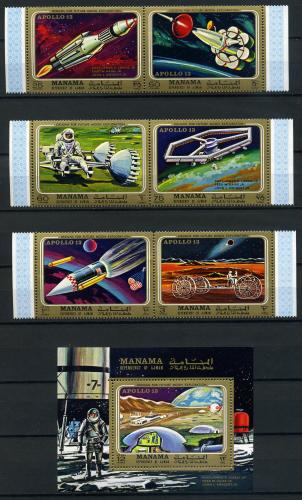 Почтовые марки. Манама. 1970г. №291-296. Блок №63. Космос. Аполлон-13.