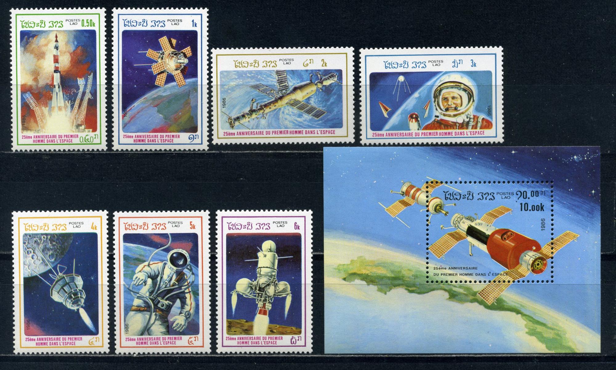 Почтовые марки. Лаос. 1986г. Космос. Астронавты. №904-910. Блок №110 (Mi: 12.00€).