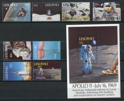 Почтовые марки. Лесото. 1989г. Космос. Высадка на Луну. № 792-799 + Блок №67 (Mi: 20.00 Е).