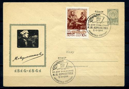 ХМК с маркой и СГ. СССР 1964 г. СГ-150 лет со ДР М. Лермонтова. КО.