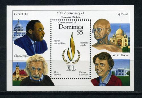 Почтовые марки. Доминика. 1988г. Права человека. Ганди. Эйнштейн. Блок №142.
