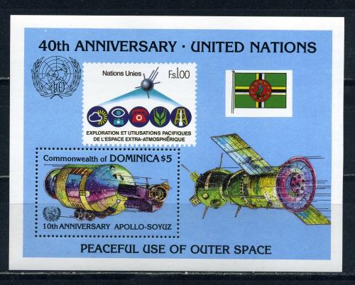 Почтовые марки. Доминика. 1985г. ООН. Космос. Союз-Аполлон. Блок №105.