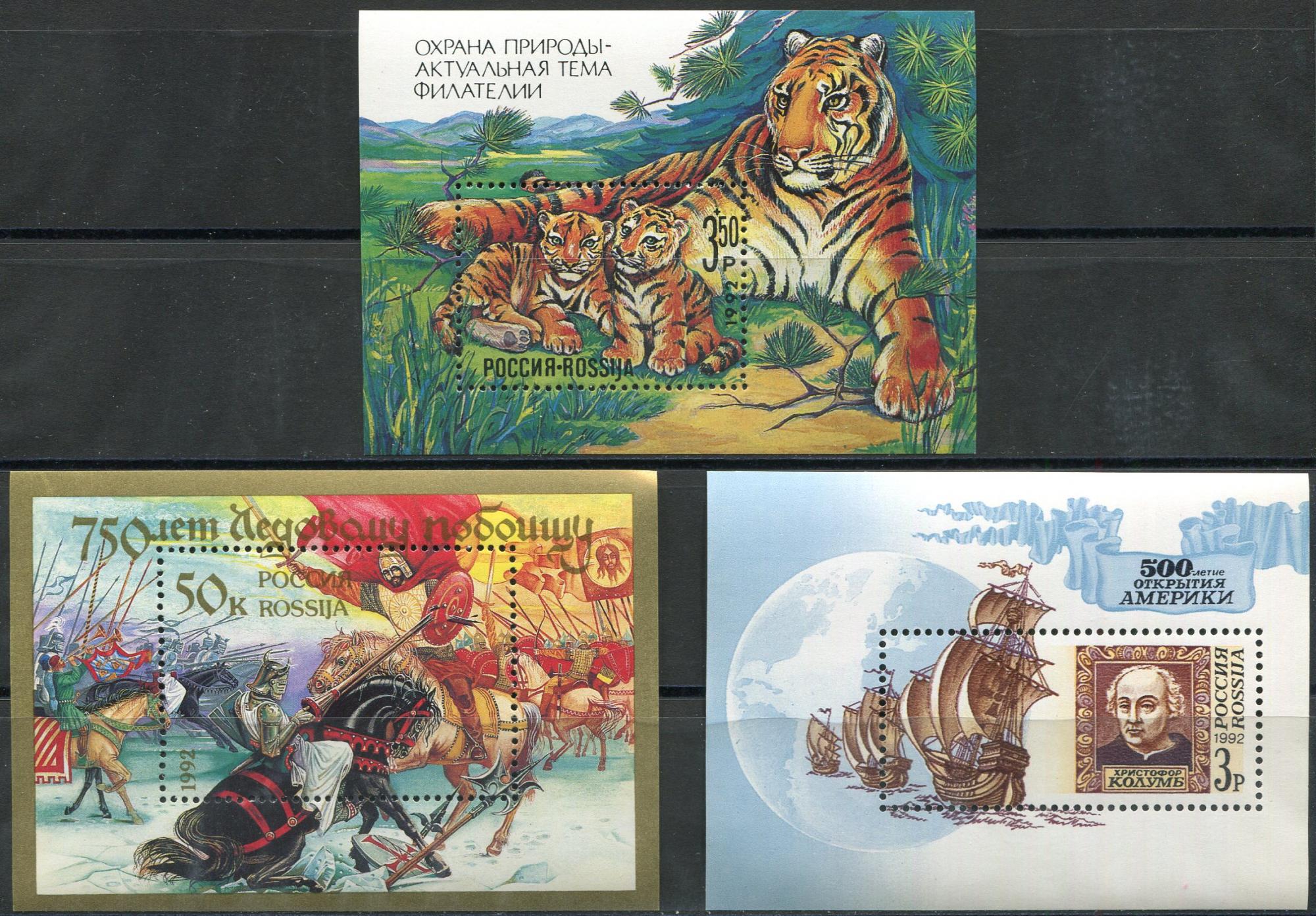 Почтовые марки. Россия. 1992. Тигры. Ледовое побоище. Колумб. Открытие Америки. Блоки. № 4, 5, 11.