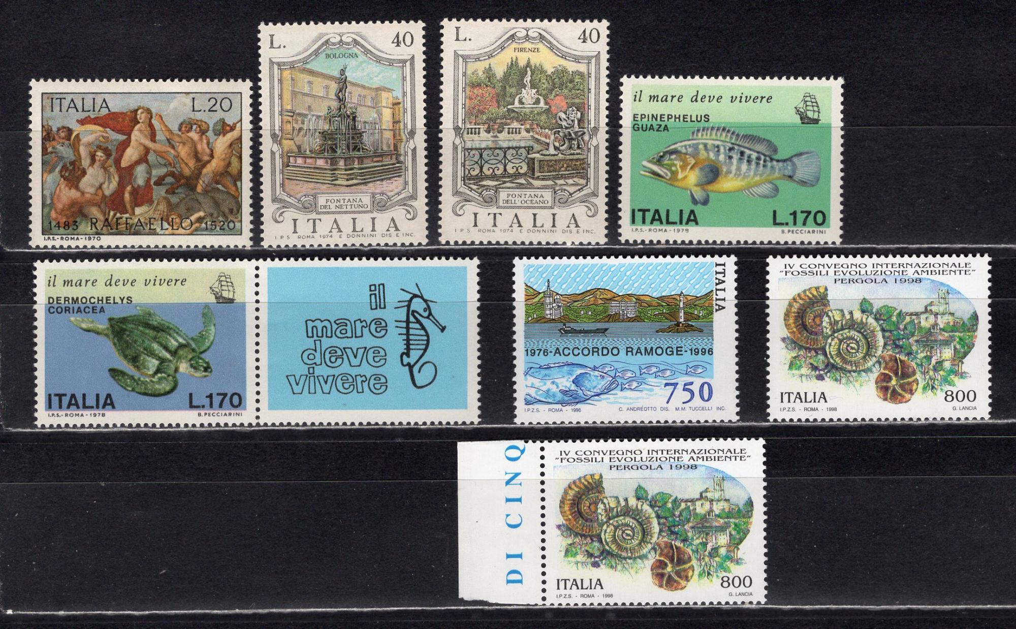 Почтовые марки. Италия. 1970-1998гг. Искусство. Рыбы. Ракушки. Сборный лот. №1305.1469-1470.1603-1604.2434.2570.