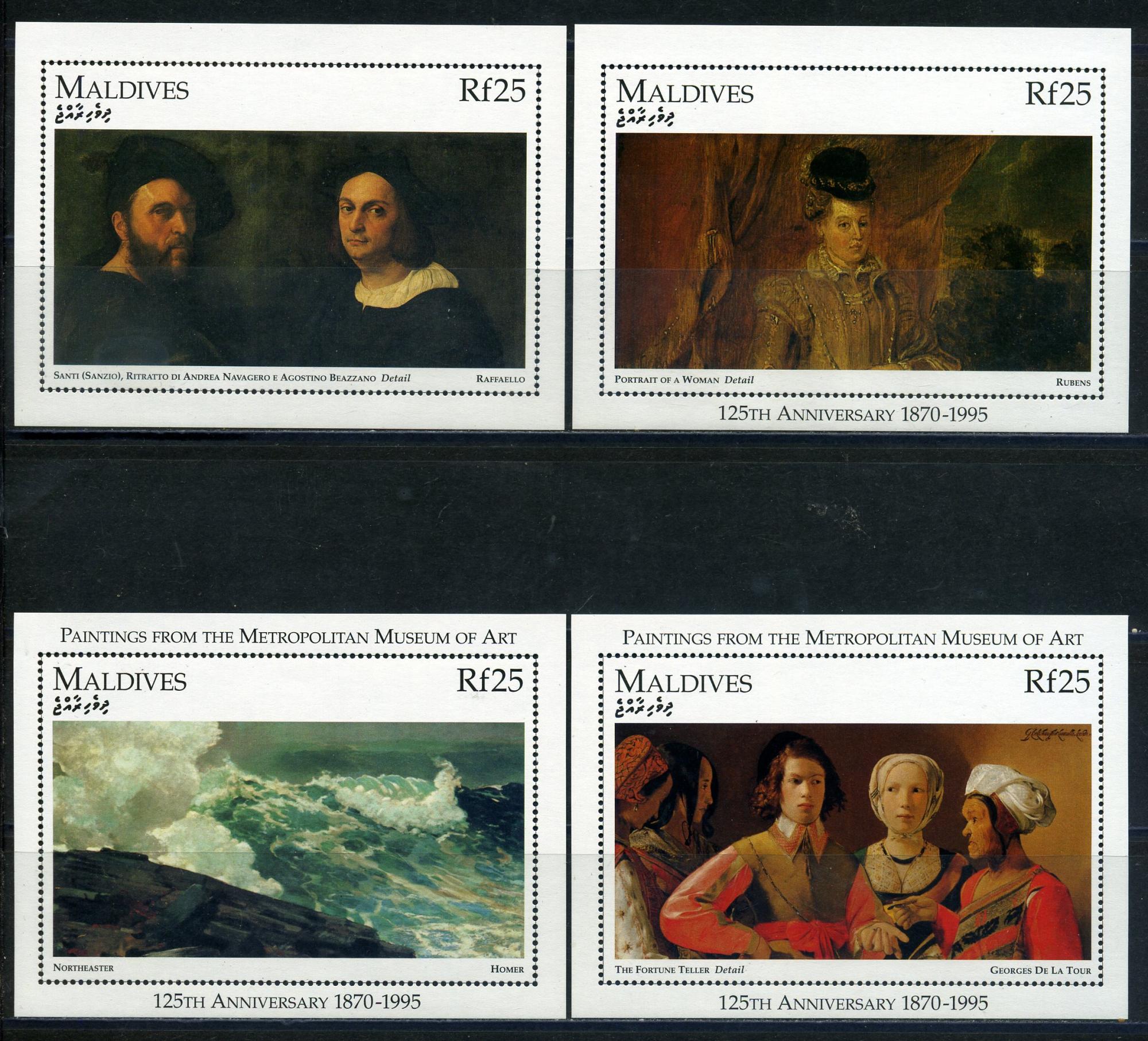 Почтовые марки. Мальдивы 1996 г. Живопись музея. Метрополитен. Рубенс. Рафаэль. БЛ 356-358
