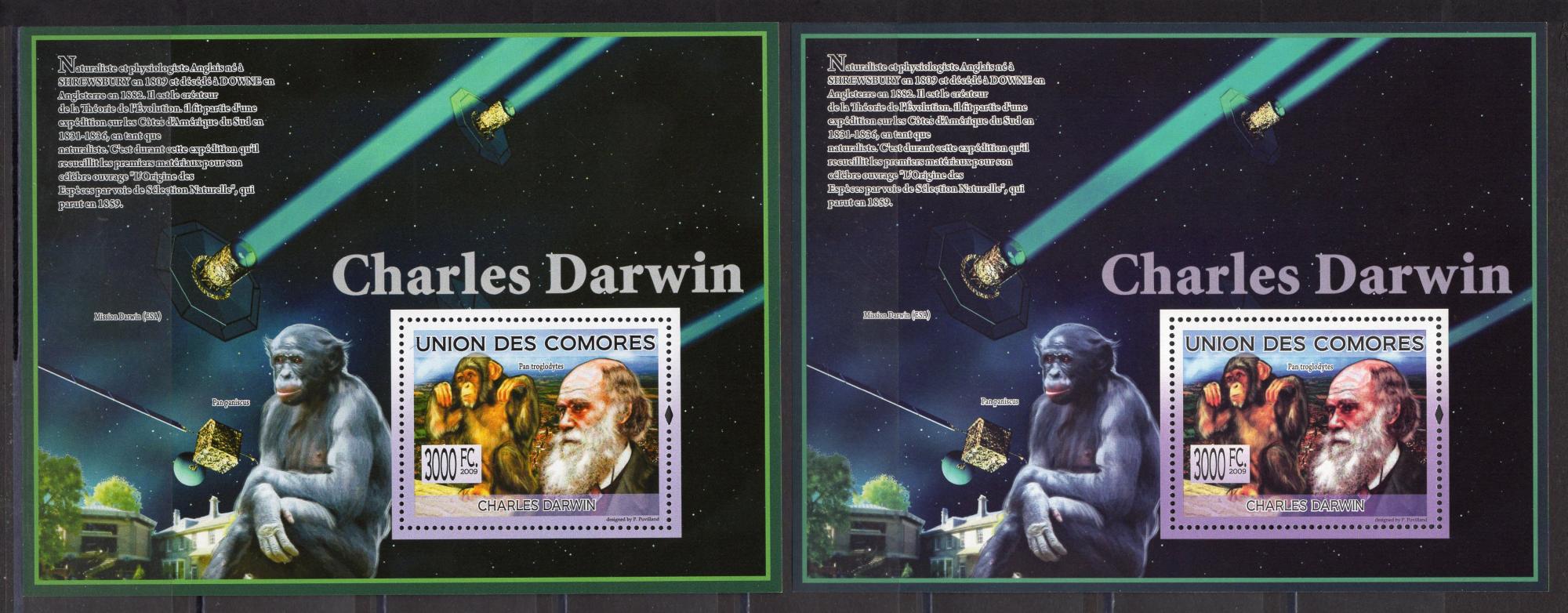 Почтовые марки. Коморы. 2009г. Чарльз Дарвин. Шимпанзе. Космос. Блок №490. (Разные Цвета!)