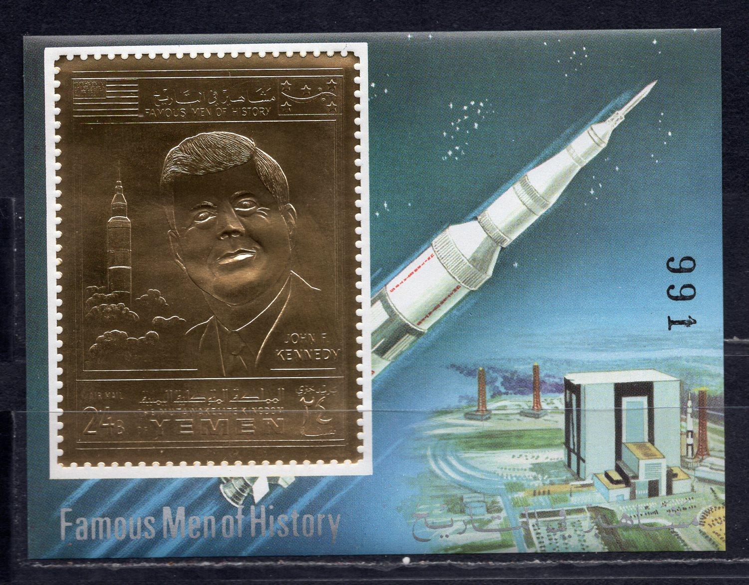 Почтовые марки. Йемен. 1969г. Космос. Кеннеди. Фольга. Золото. Блок №172в. Беззубц.