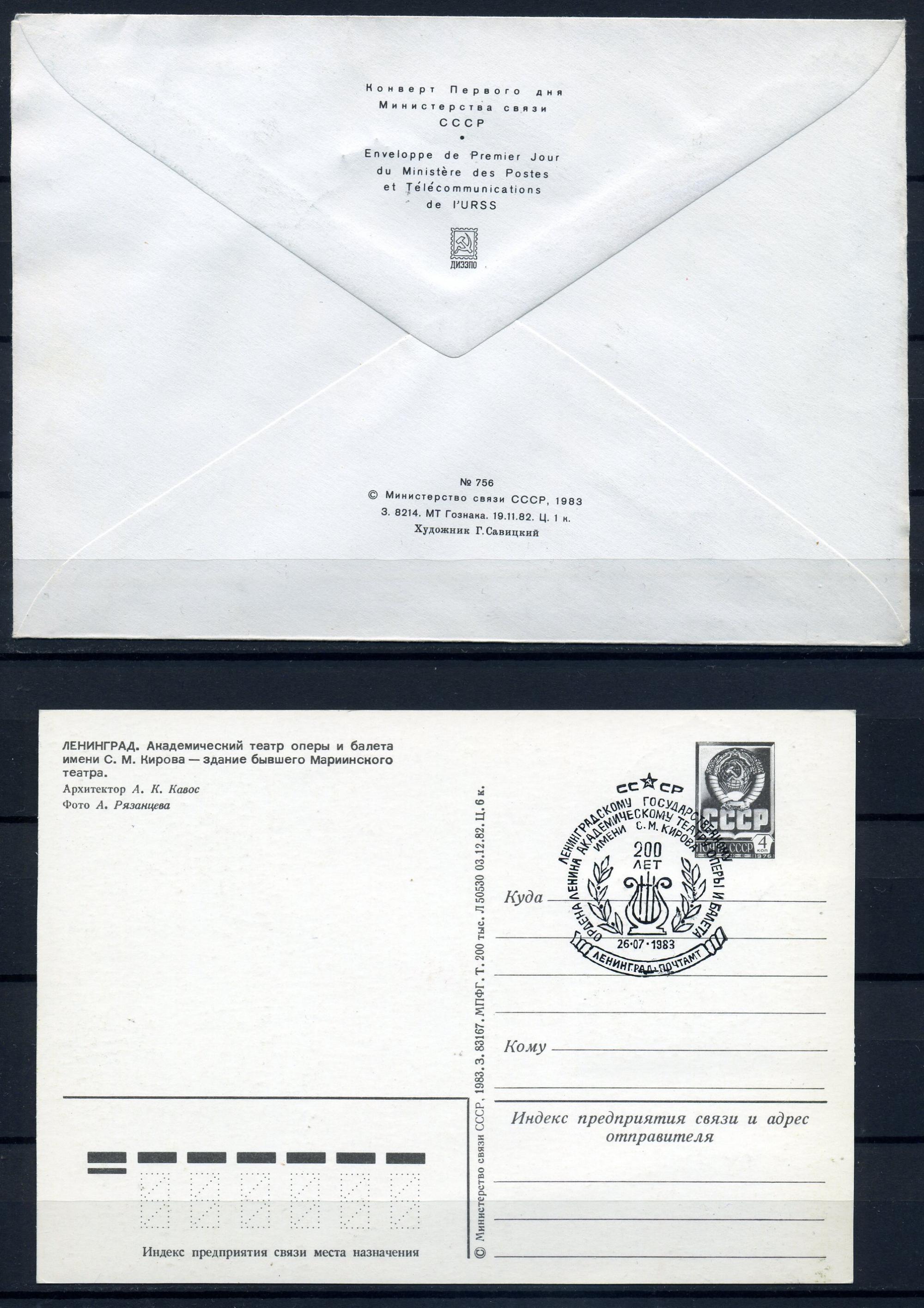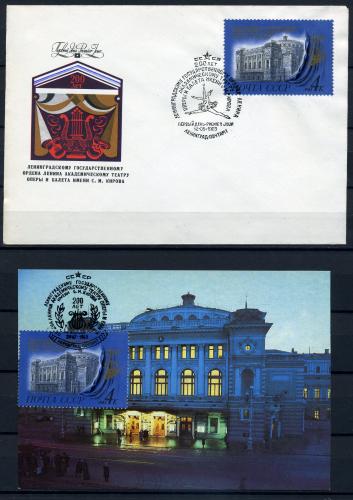 Немаркированный конверт с маркой и СГ + картмаксимум. СССР 1983 г. 200 лет театру оперы и балета им. Кирова. КЗ.
