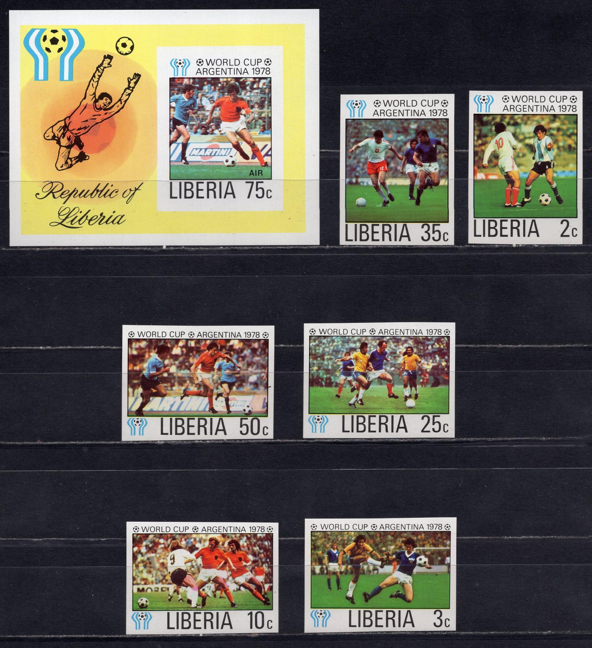 Почтовые марки. Либерия, 1978г. Футбол. №1061-1066В, Бл. 90В. Безз.