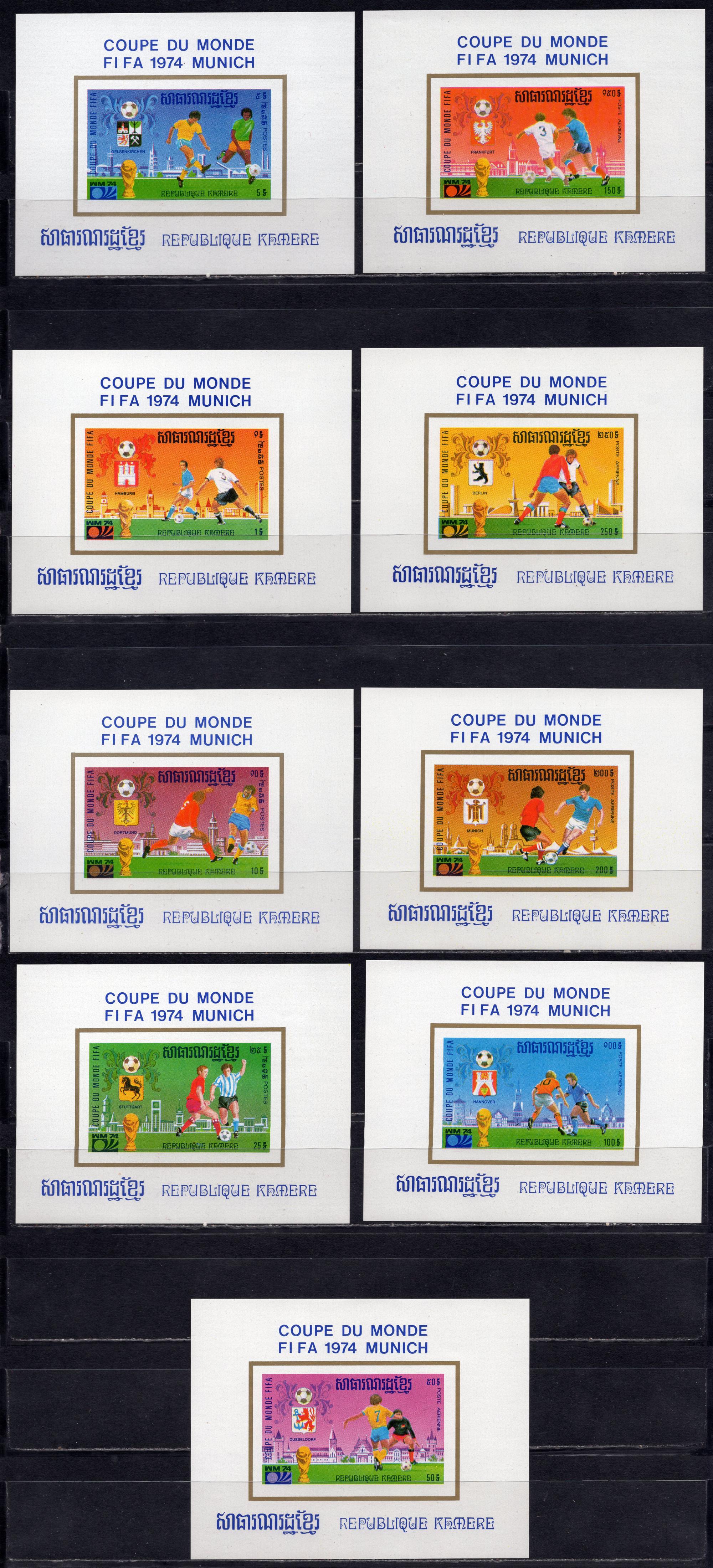 Почтовые марки. Камбоджа, 1975 г. Чемпионат мира по футболу, Германия (1974) (III): Города-хозяева. Бл. 94 - 102. (Mi 350.00 €)