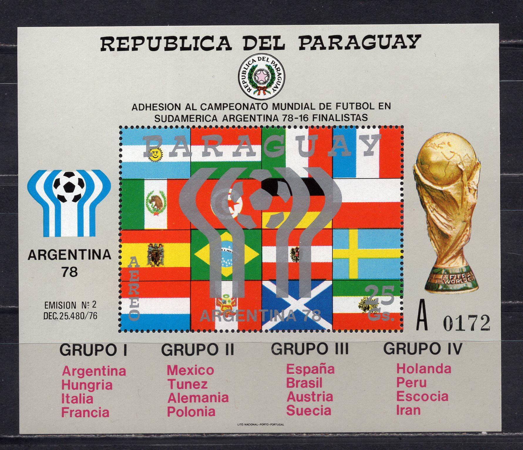 Почтовые марки. Парагвай, 1978 г. Футбол. Флаги 16 финалистов, эмблема Чемпионата мира по футболу 1978 года. Бл. 320 (Mi 30.0 e)