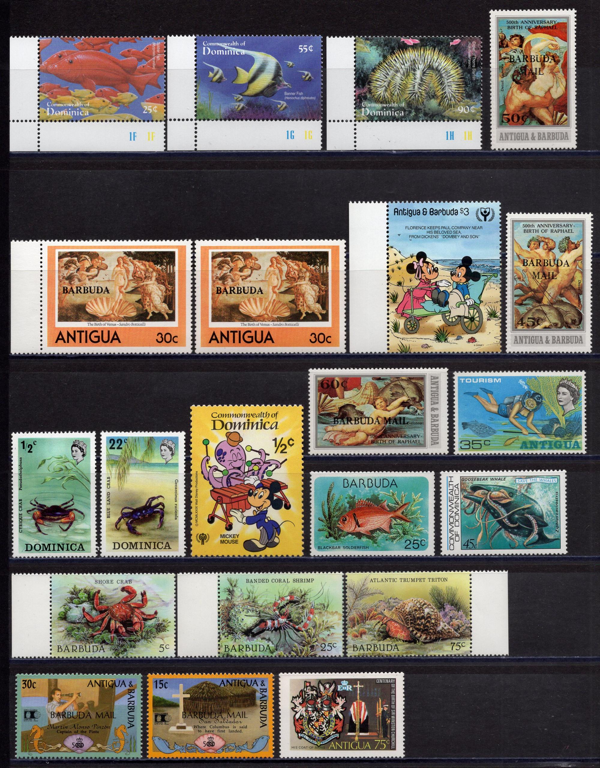Почтовые марки. Доминика и Барбуда. 1968-2001г. Морские животные. Ракушки. Надпечатки. Сборный лот.