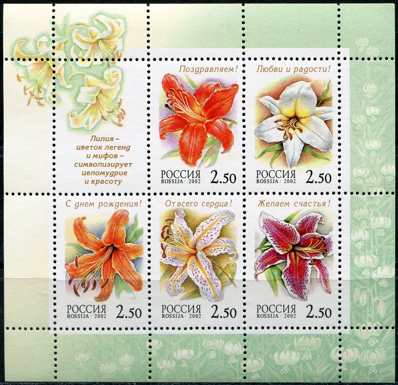 Почтовые марки. Россия. 2002г. Лилии. МЛ. №734-738.