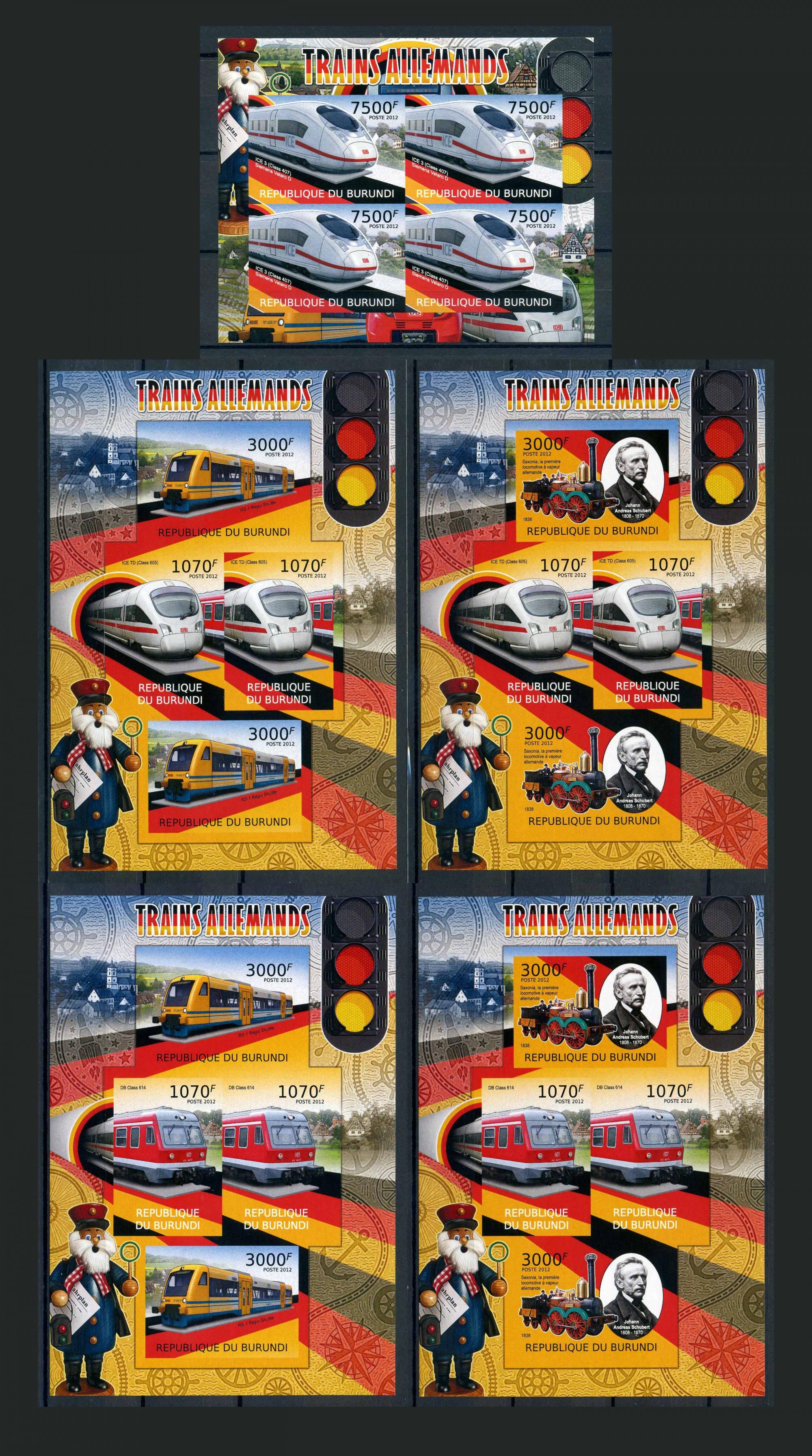 Почтовые марки. Бурунди. 2012г. Локомотивы Германии. Беззуб. №2445-2448. МЛ.