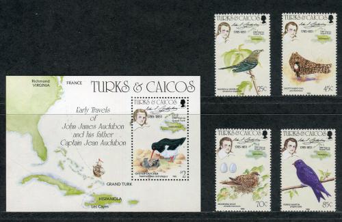 Почтовые марки. Теркс и Кайкос 1985 г. Джон Джеймс Одюбон—американский натуралист, орнитолог и художник-анималист. Mi: № 718-721, Блок № 54. MI:21,50 €