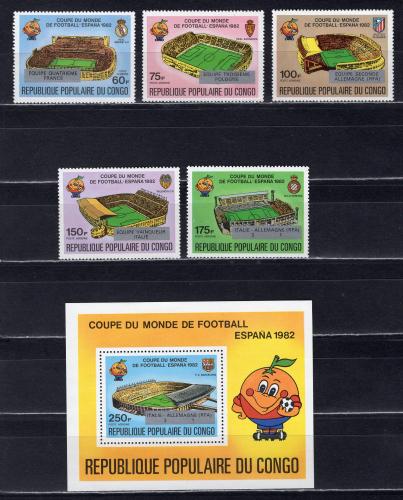 Почтовые марки. Конго. 1982г. Футбол. Надпечатка. №883-887. Блок №32.