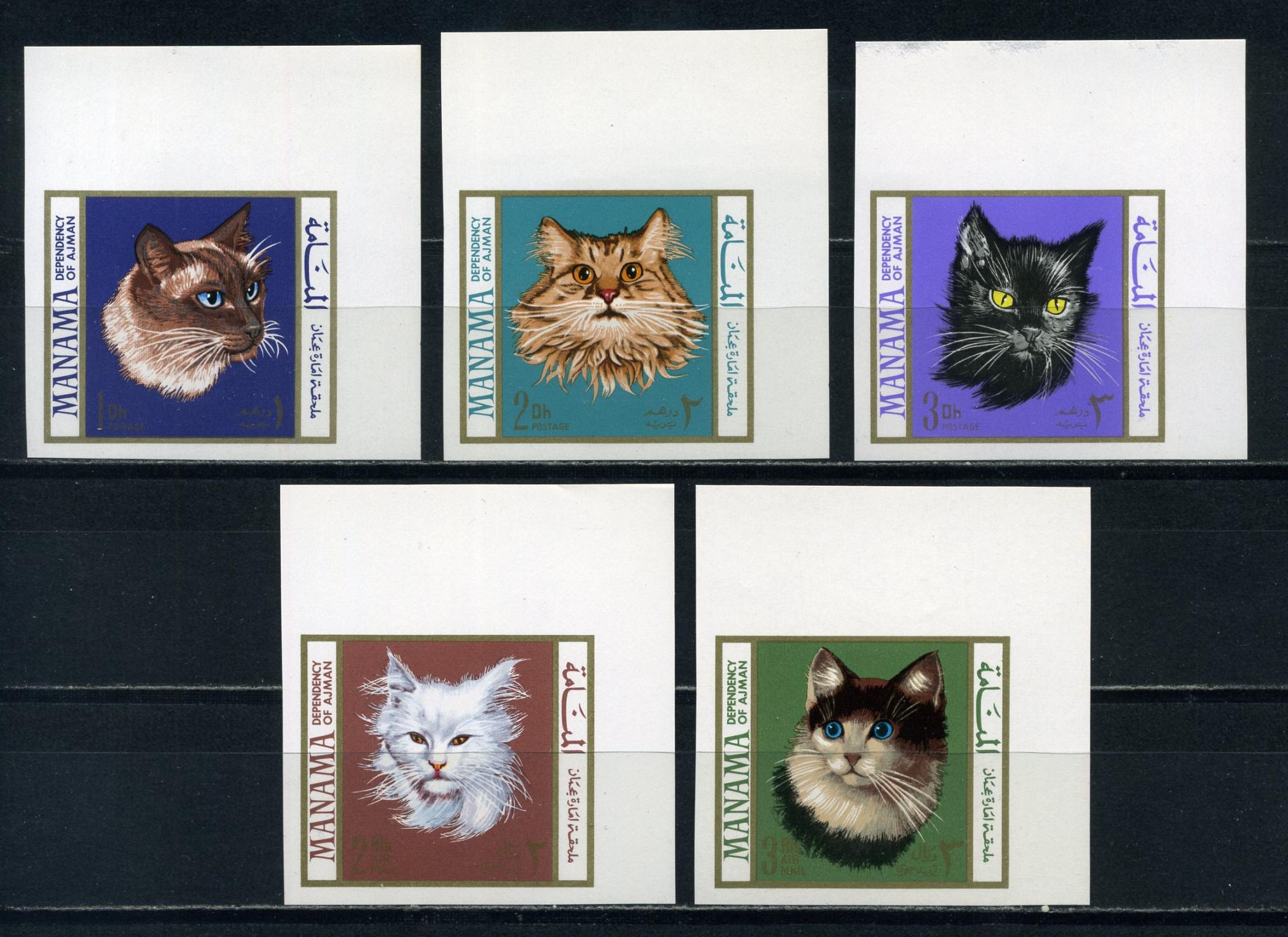 Почтовые марки. Манама. 1968г. Кошки. №107В-111В. Беззубц.