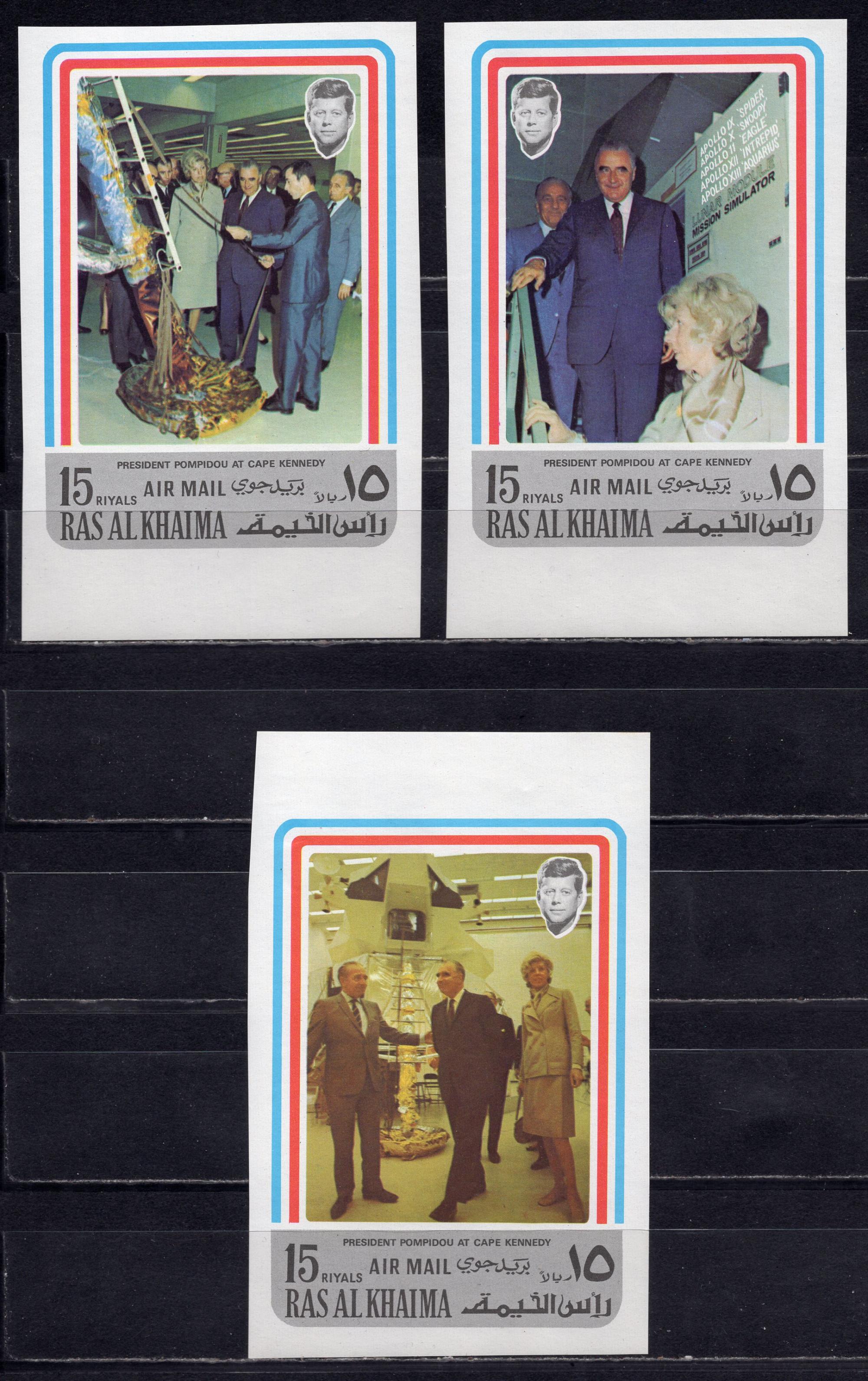 Почтовые марки. Рас-Эль-Хайма. 1972г. Жорж Помпиду и Кеннеди. Космос. №766-768В. Беззубц. (Mi: 36.00 Е).