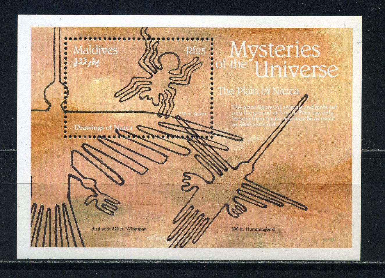Почтовые марки. Мальдивы. 1992г. Загадки Вселенной. Рисунки пустыни Наска. Блок №254.