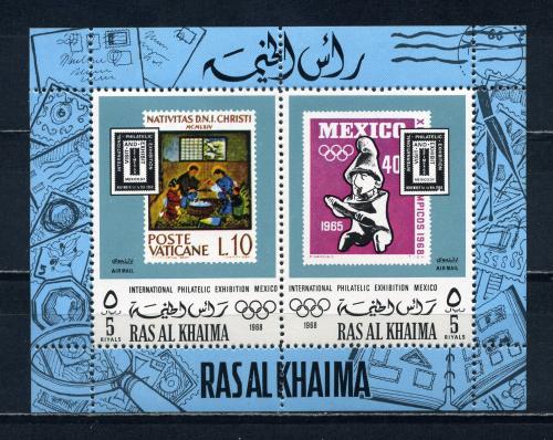 Почтовые марки. Рас-эль-Хайма. 1969г. Филвыставка. Олимп.игры. Блок №70.