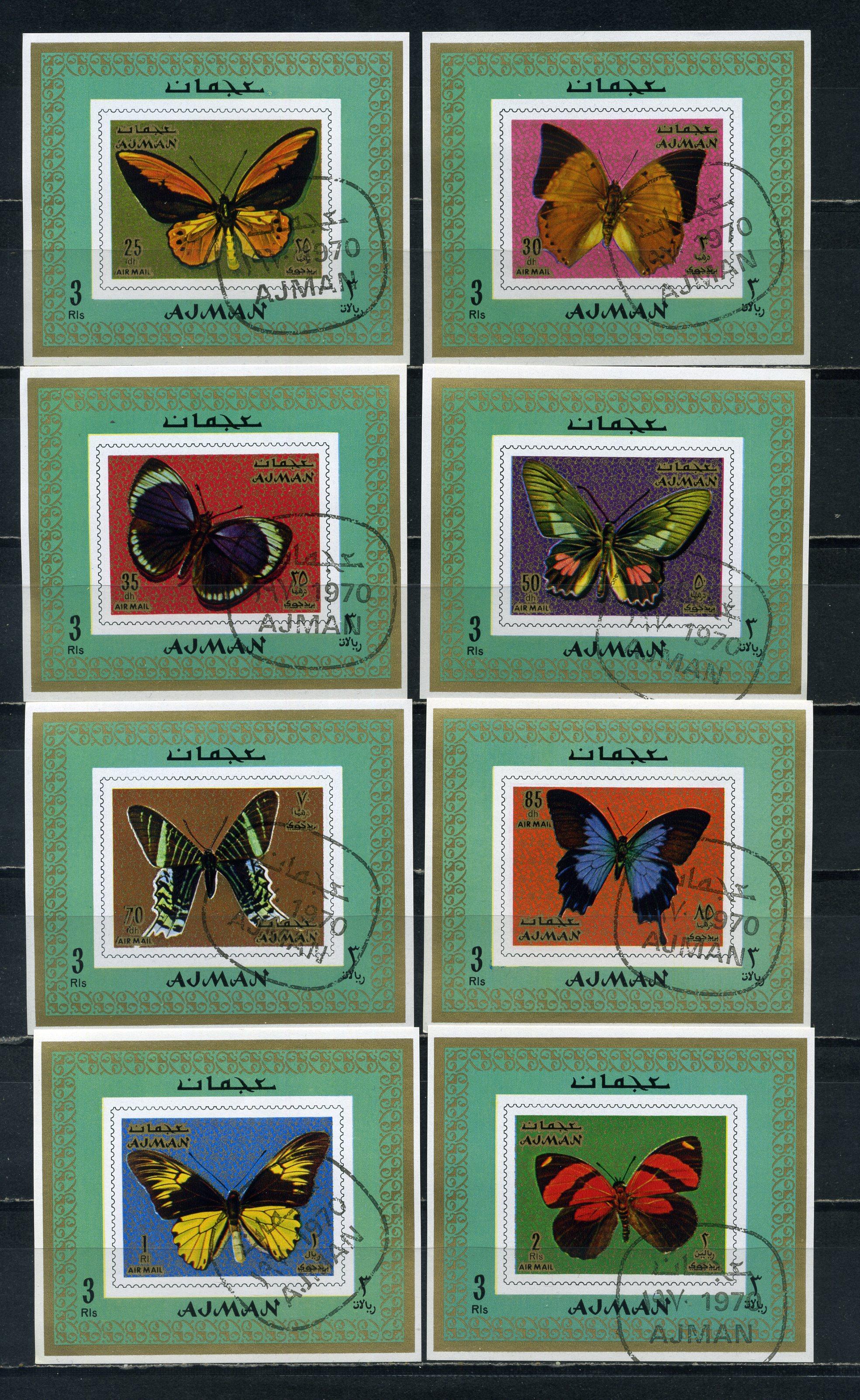 Почтовые марки. Аджман. 1971г. Бабочки. №747-754. Люкс-блоки.
