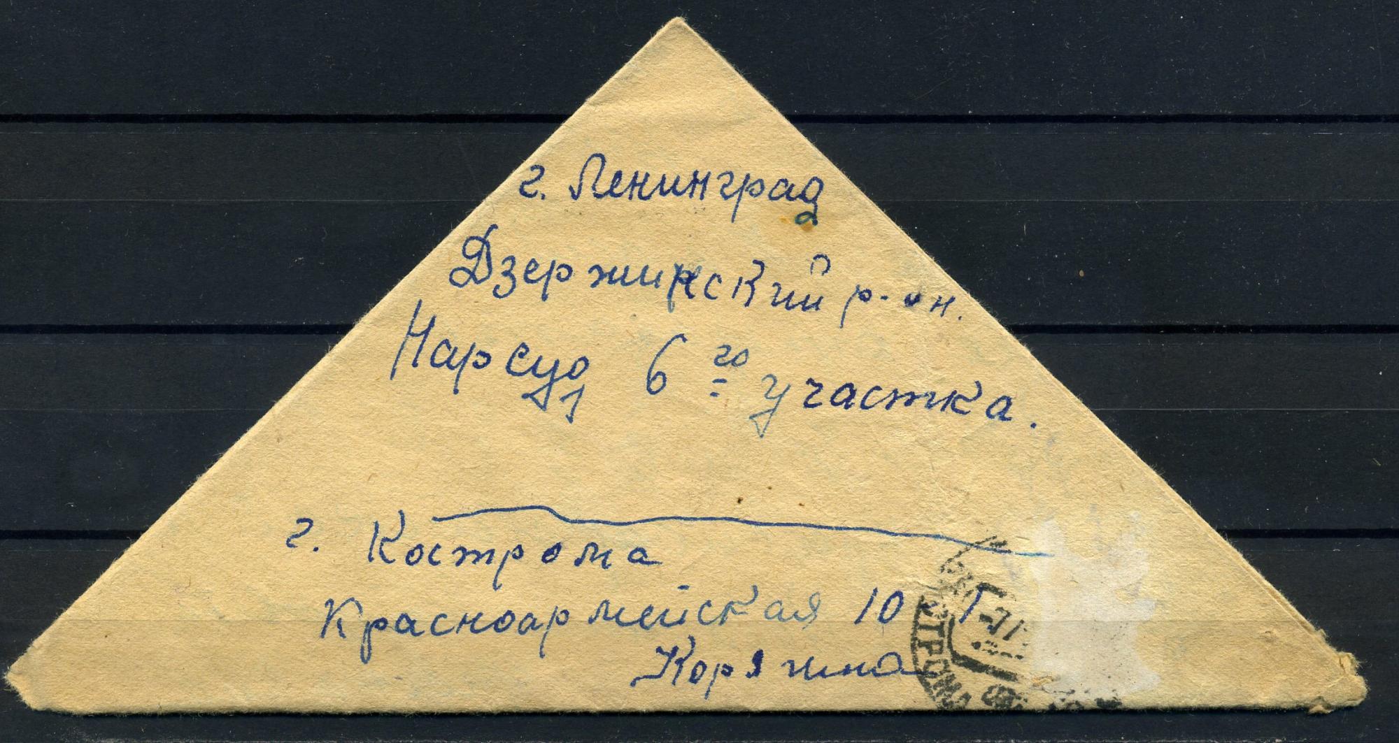 Письмо треугольник. СССР 1950 г. Кострома-Лениград.