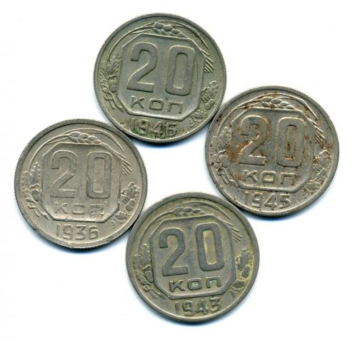 Монеты СССР. 20 копеек 1936-1946 г. 4 шт.
