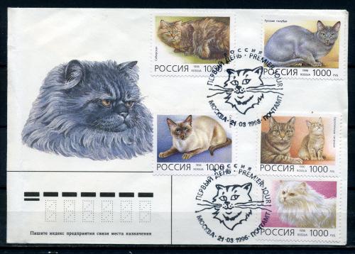 немаркированный конверт с марками и СГ. Россия 1996 г. Кошки. КО.