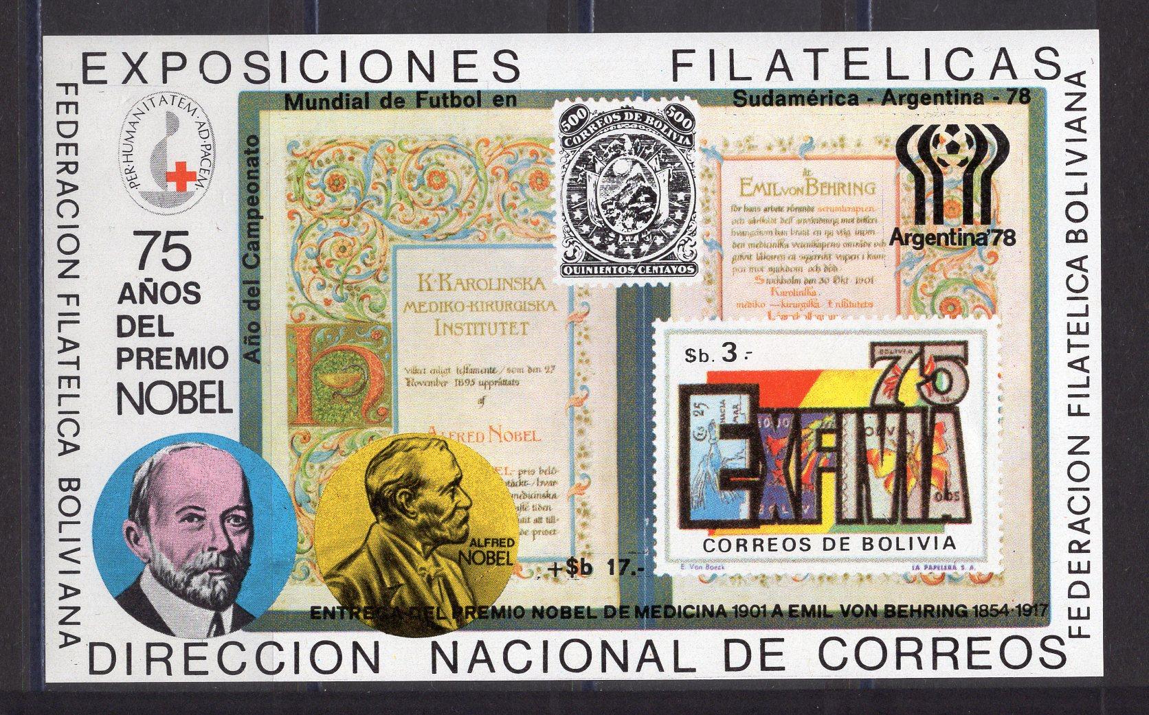 Почтовые марки. Боливия. 1975г. Альфред Нобель. Футбол. Блок №64.