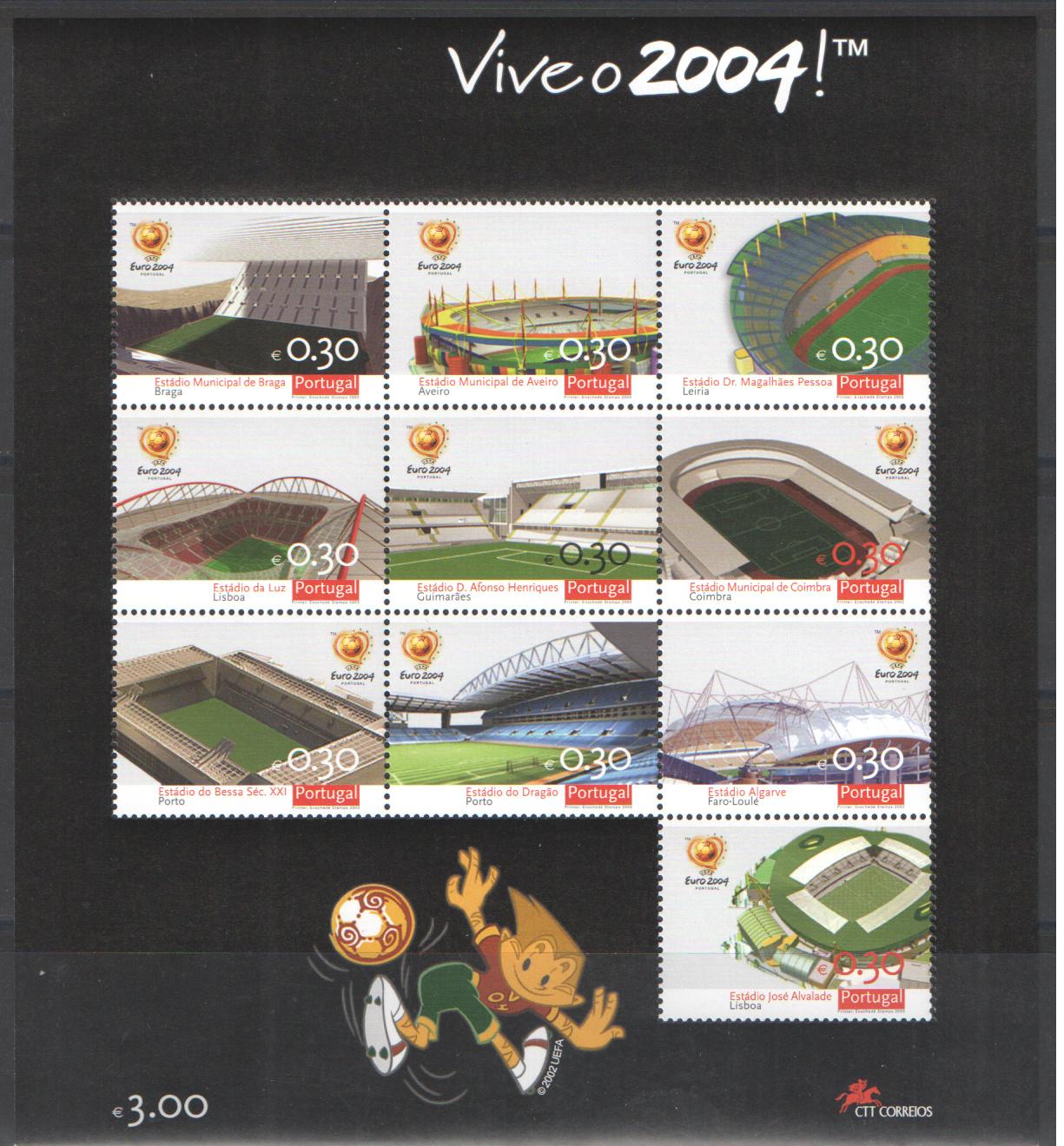 Почтовые марки. Португалия. 2003г. Футбол. Стадионы. ЛИСТ. №2747-2756.