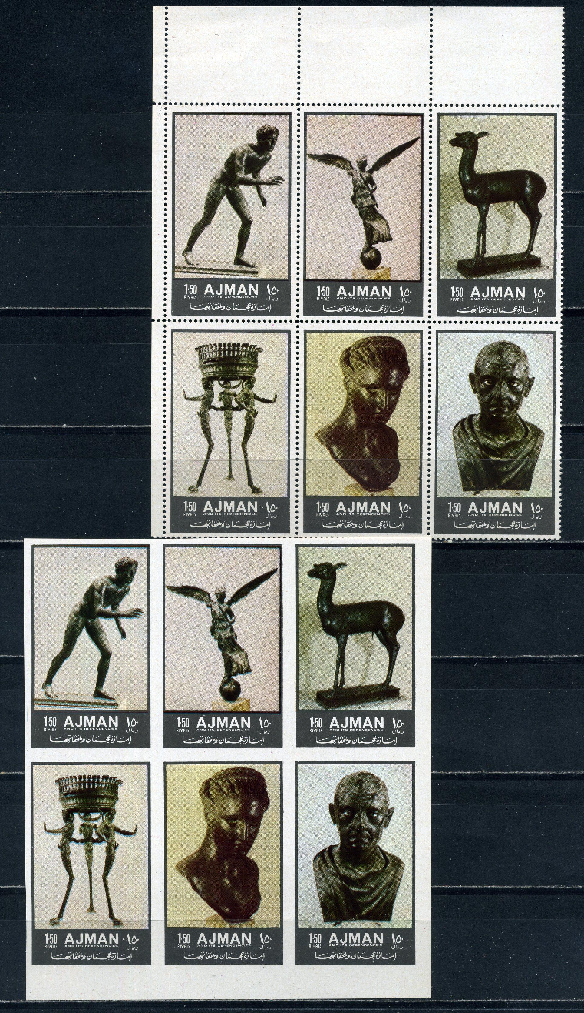 Почтовые марки. Аджман. 1972г. Скульптуры и изделия из бронзы. №2064-2069 А+В. Зубц. и беззубц.