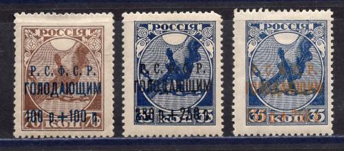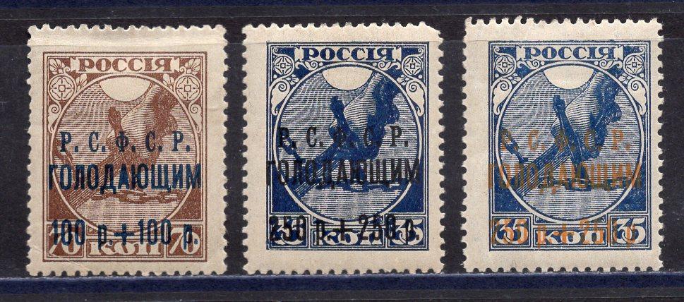 Почтовые марки. РСФСР. 1921г. Первая марка. Надпечатка ГОДОДАЮЩИМ. №32, №35, №37.