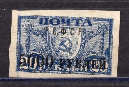 Почтовые марки. РСФСР. 1921г. Стандарт. Надпечатка. Ультрамар. №17а. БЕЗ КЛЕЯ!