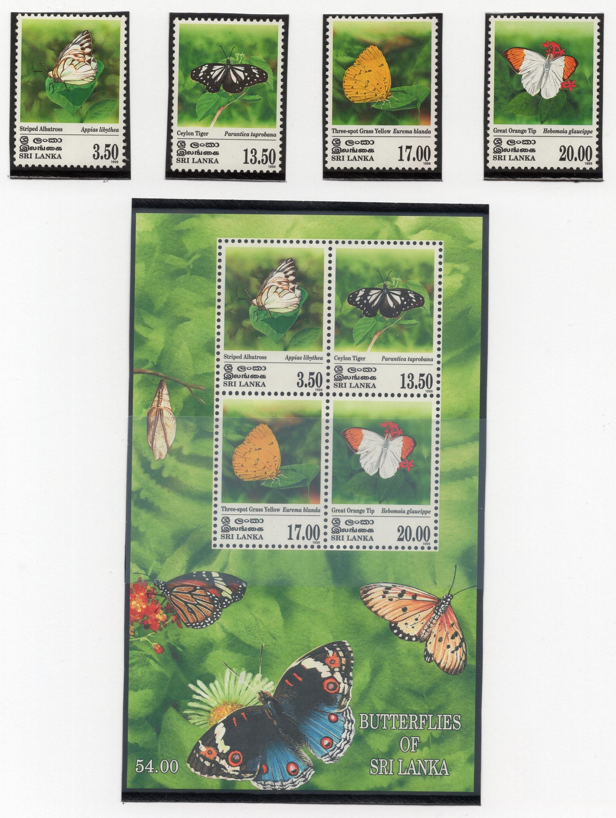 Почтовые марки. Шри-Ланка, 1999 г. Бабочки. №1234-1237. Бл. 78.