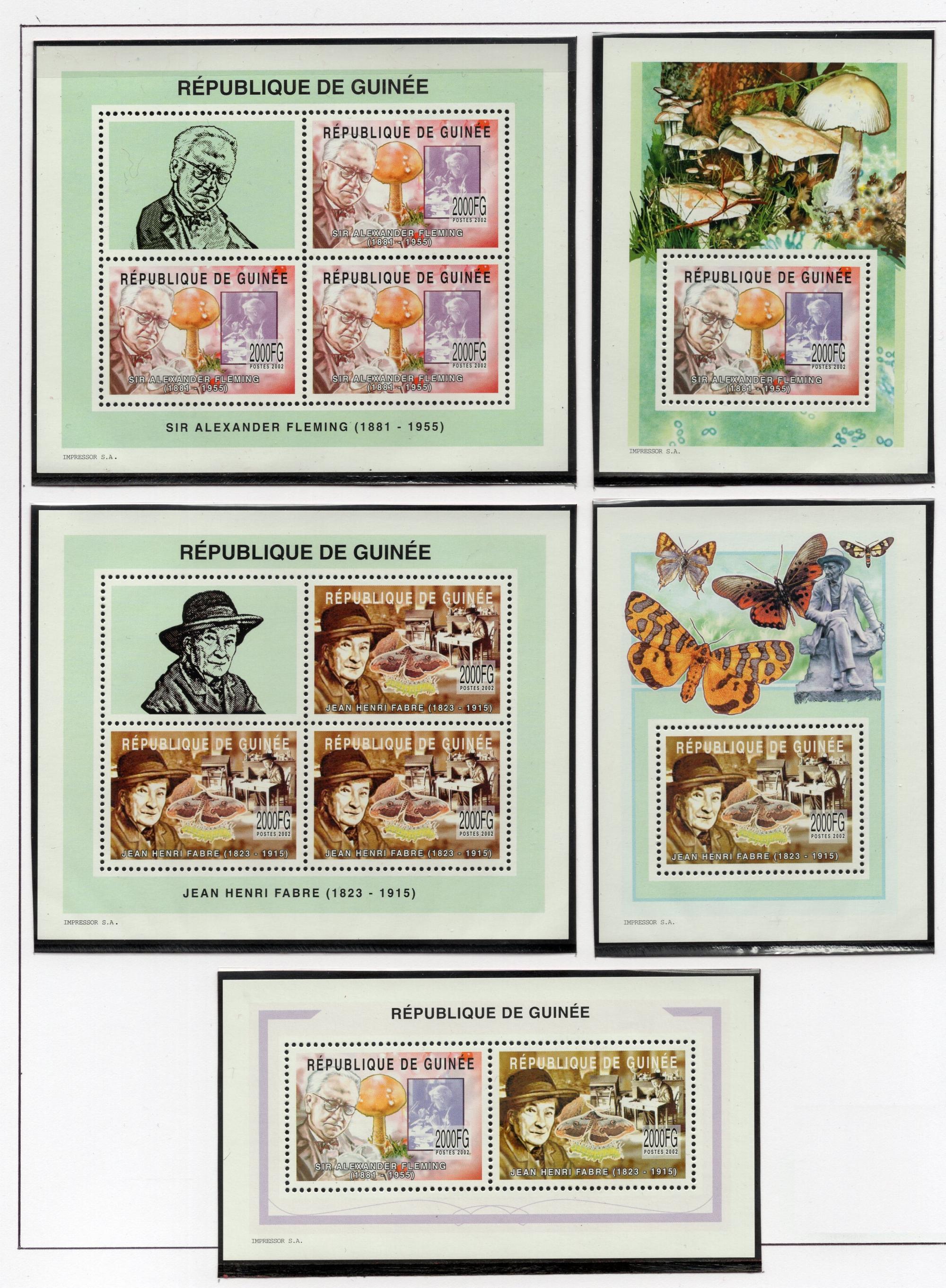 Почтовые марки. Гвинея, 2002 г. Грибы. Бабочки. Жан Анри Фабр. Александр Флеминг. №3997-3998, Бл. 769-770.