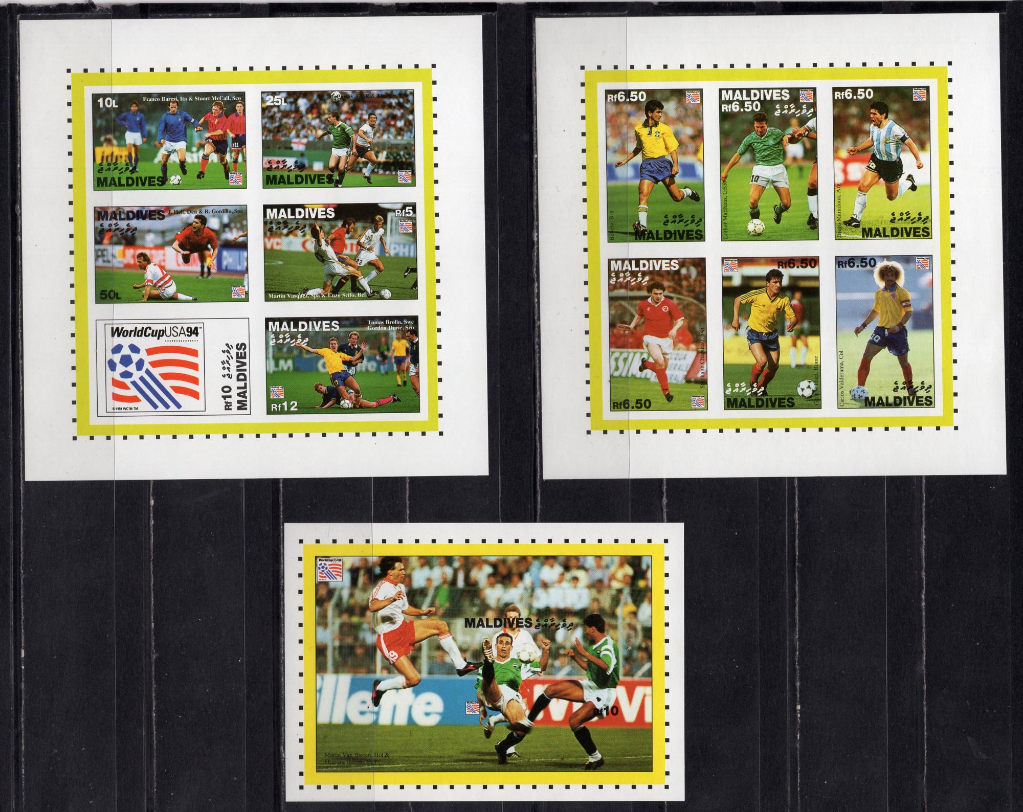 Почтовые марки. Мальдивы, 1994 г. Футбол. №2214-2219В, 2220-2225В, Бл. 315В. Безз.