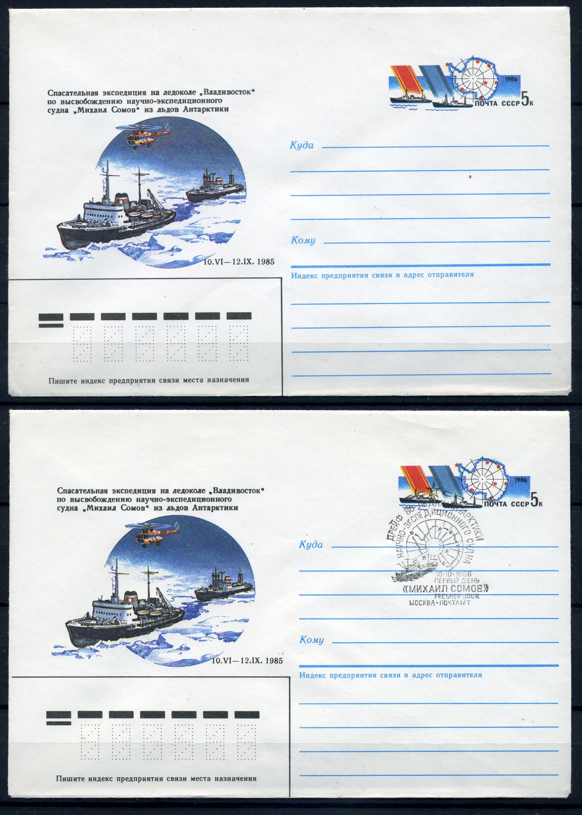 Конверты с ОМ чист. + СГ. СССР 1986 г. Спасательная экспедиция на ледоколе "Владивосток" по высвобождению судна "Михаил Сомов". КО.